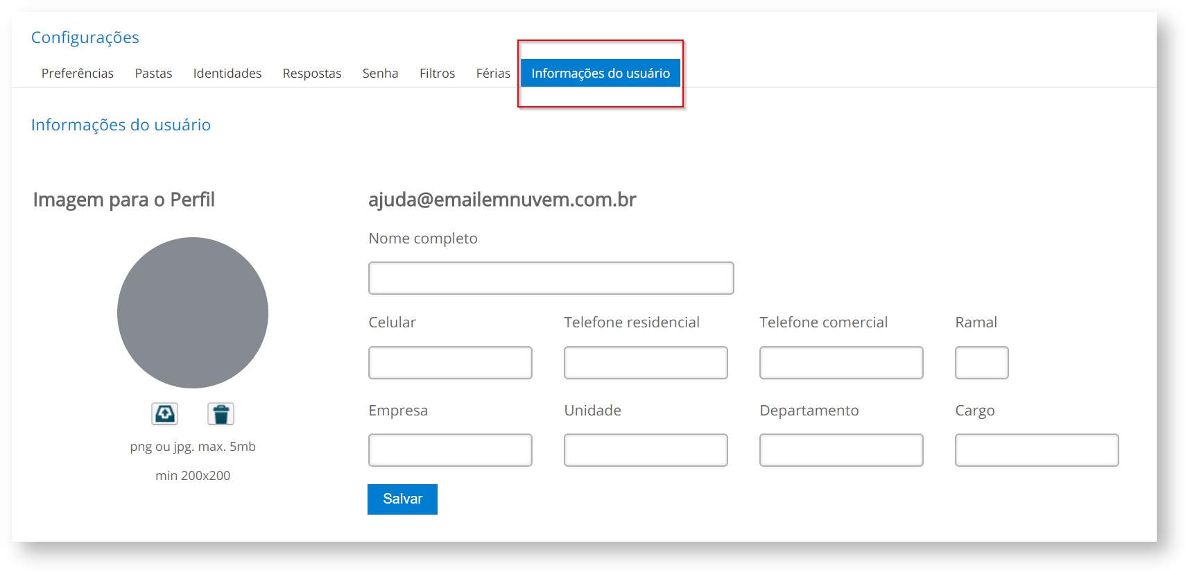 - No Webmail, clique em “Configurações” e em seguida clique em “Informações de usuário“:
