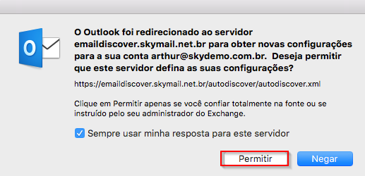 Caso solicite servidor, inclua no modelo abaixo. Em alguns casos o autodiscover já adiciona automaticamente apenas solicitando permissão no acesso, basta clicar em lembrar e permitir.