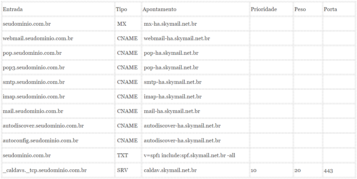Pronto! Todas as entradas estão apontadas para a Skymail!