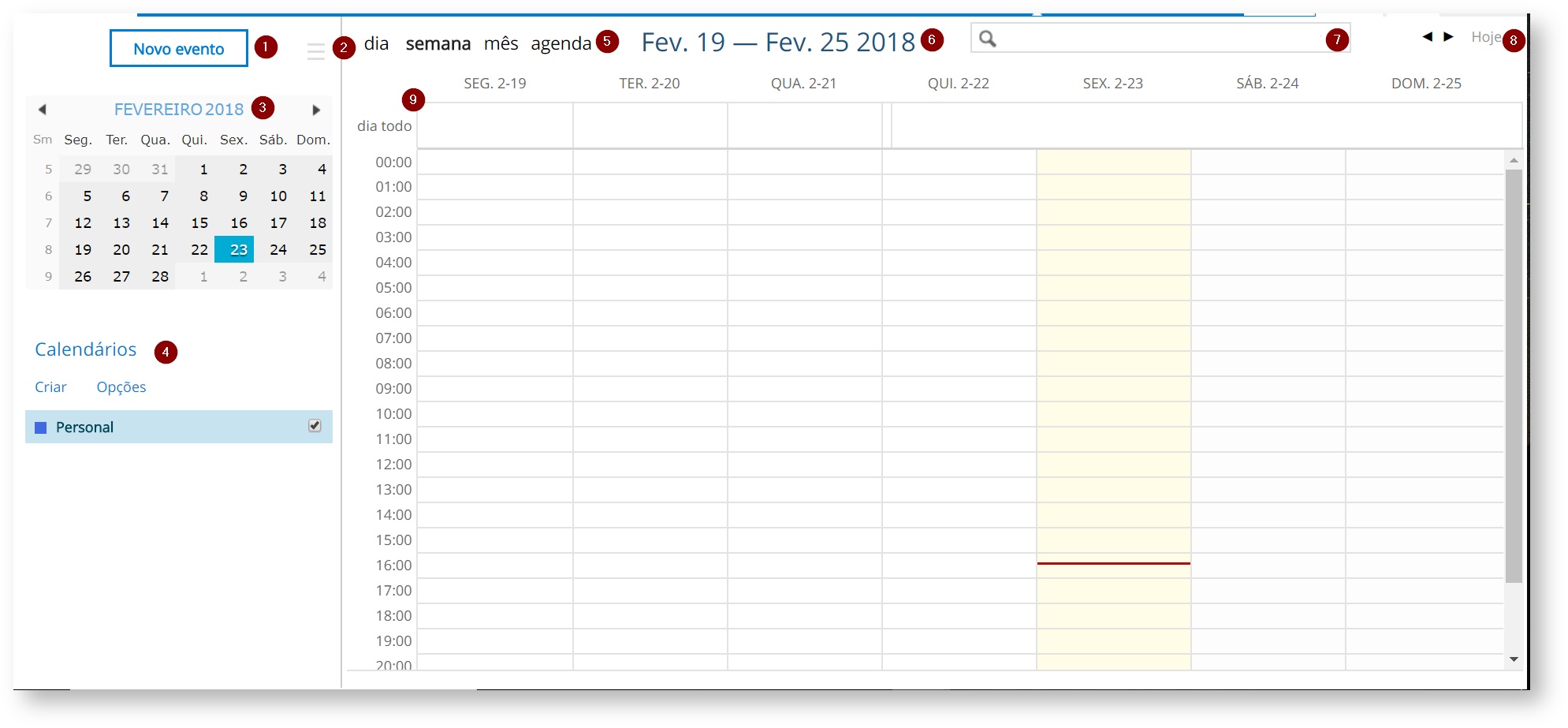 - Nessa opção o usuário pode criar novos eventos. Também é possível criar eventos clicando em cima da hora desejada no calendário para saber como criar eventos;