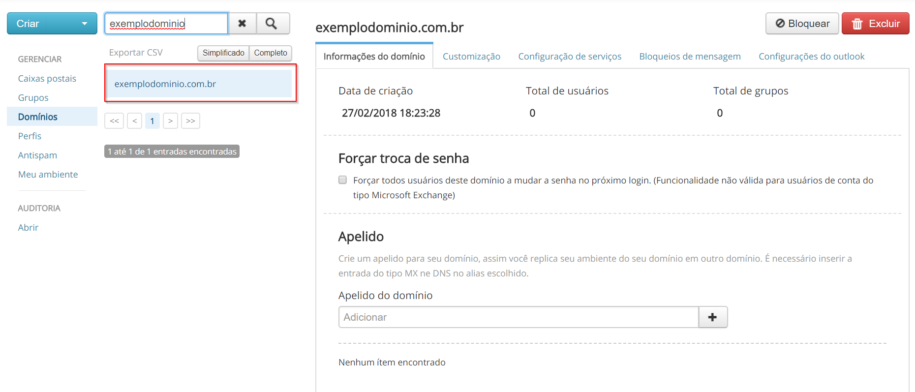 Nessa aba do painel, o administrador consegue colocar apelido para seu domínio: