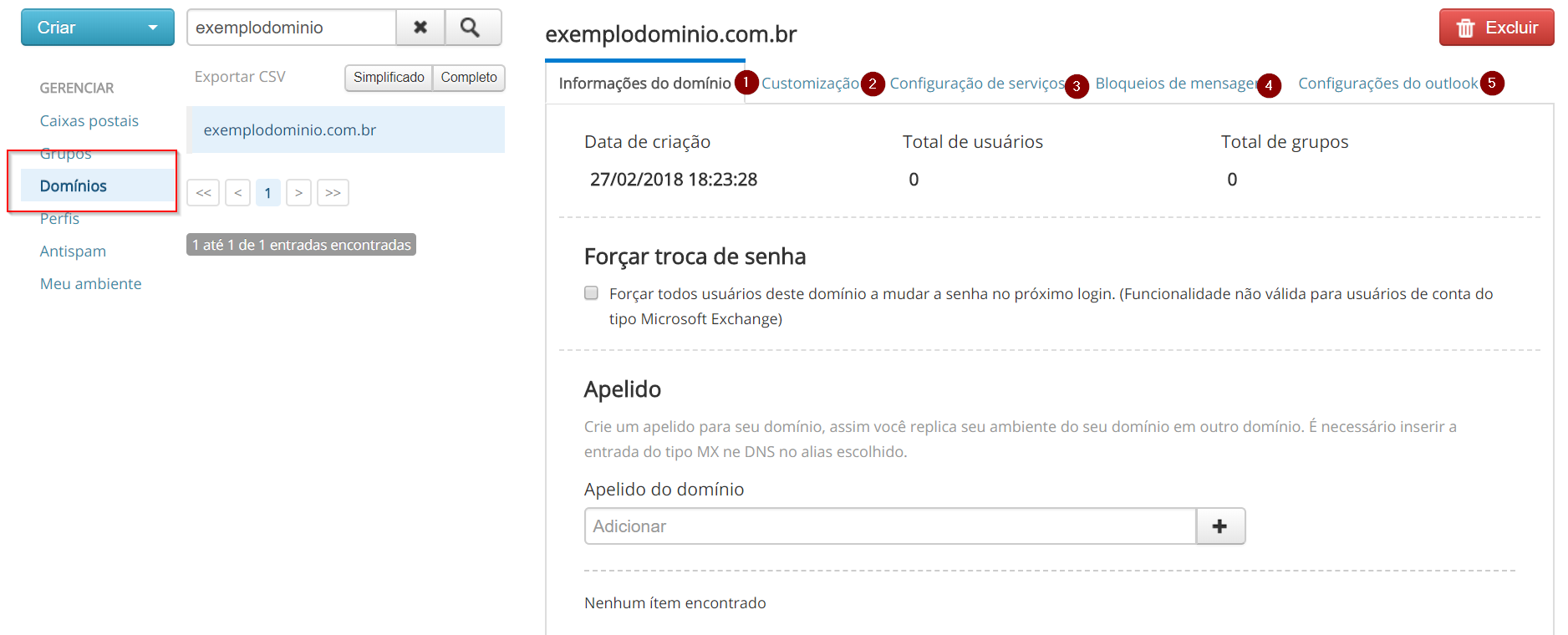 No painel de controle, na aba “Domínio” o usuário encontra as seguintes configurações: