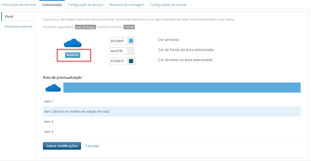 Nessa opção o usuário pode colocar a logo e as cores que vão ser usadas no Webmail e Painel de controle do seu domínio: