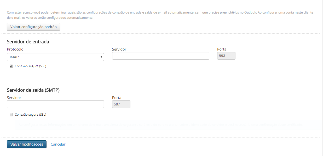 Ao inserir as entradas de DNS nas opções acima, o autodiscover do Outlook fará a inserção automática do “pop.domínio”, “imap.domínio” e “smtp.domínio” dos endereços preenchidos no campo “Servidor”.