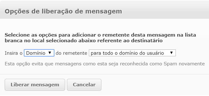 O administrador pode escolher liberar apenas as mensagens (E-mail) ou liberar o domínio todo (Domínio), assim as mensagens daquele domínio não vão ser enviadas para a quarentena.
