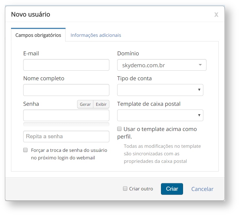 - Pode forçar o usuário a trocar a senha no primeiro acesso via Webmail selecionando a caixa a baixo da senha