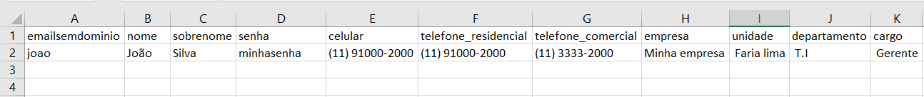 Para cada produto você deve criar uma planilha. Ex: Contratei 10 contas de 1 GB, tenho que criar uma planilha exclusiva para as contas de 1 GB. Campos obrigatório na planilha: E-mail, Nome, Senha.