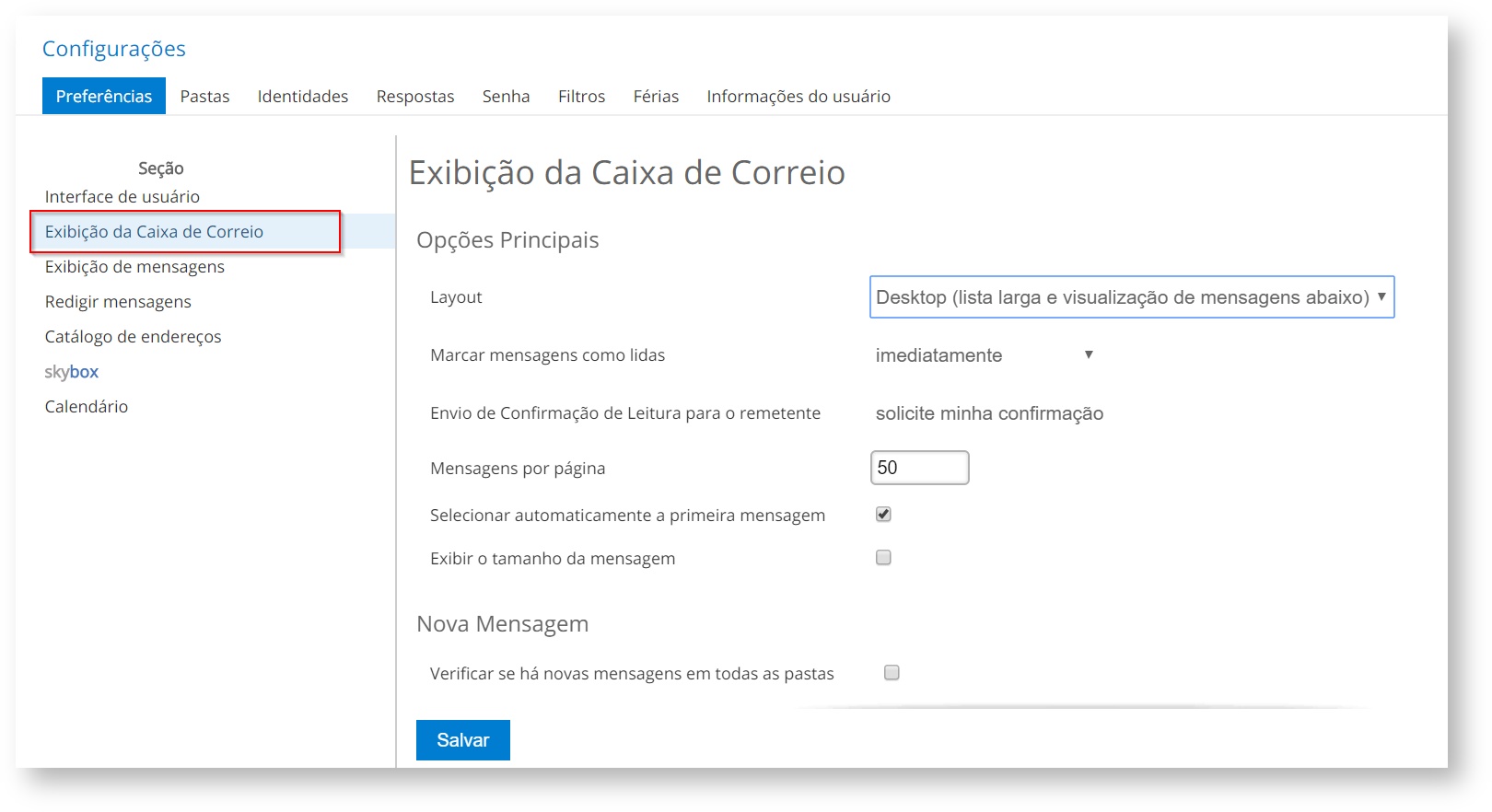 Mensagens por página: o usuário define a quantidade de mensagens exibidas na sua caixa de correio;