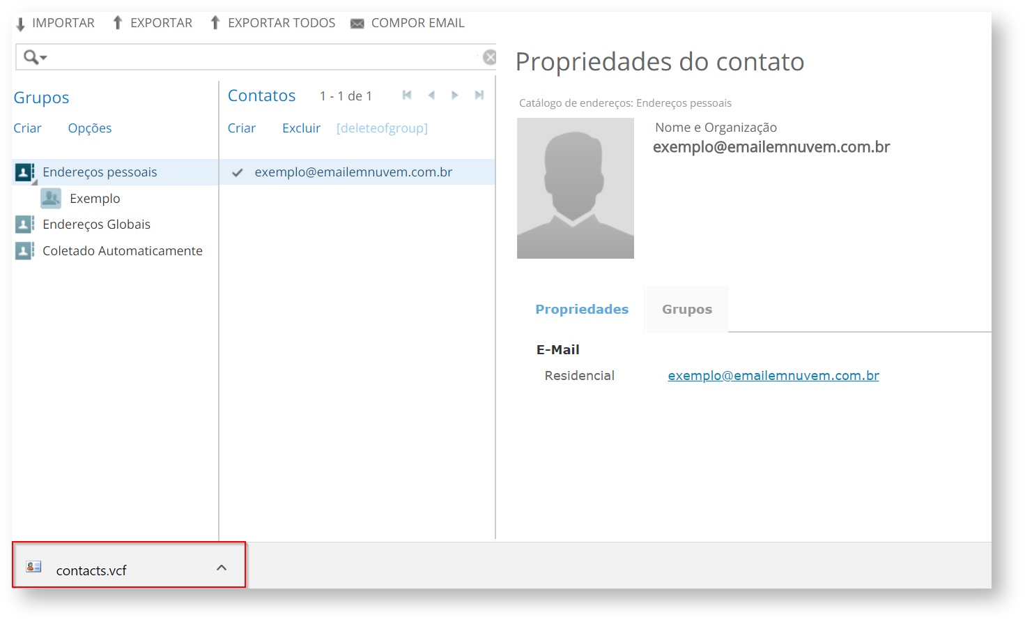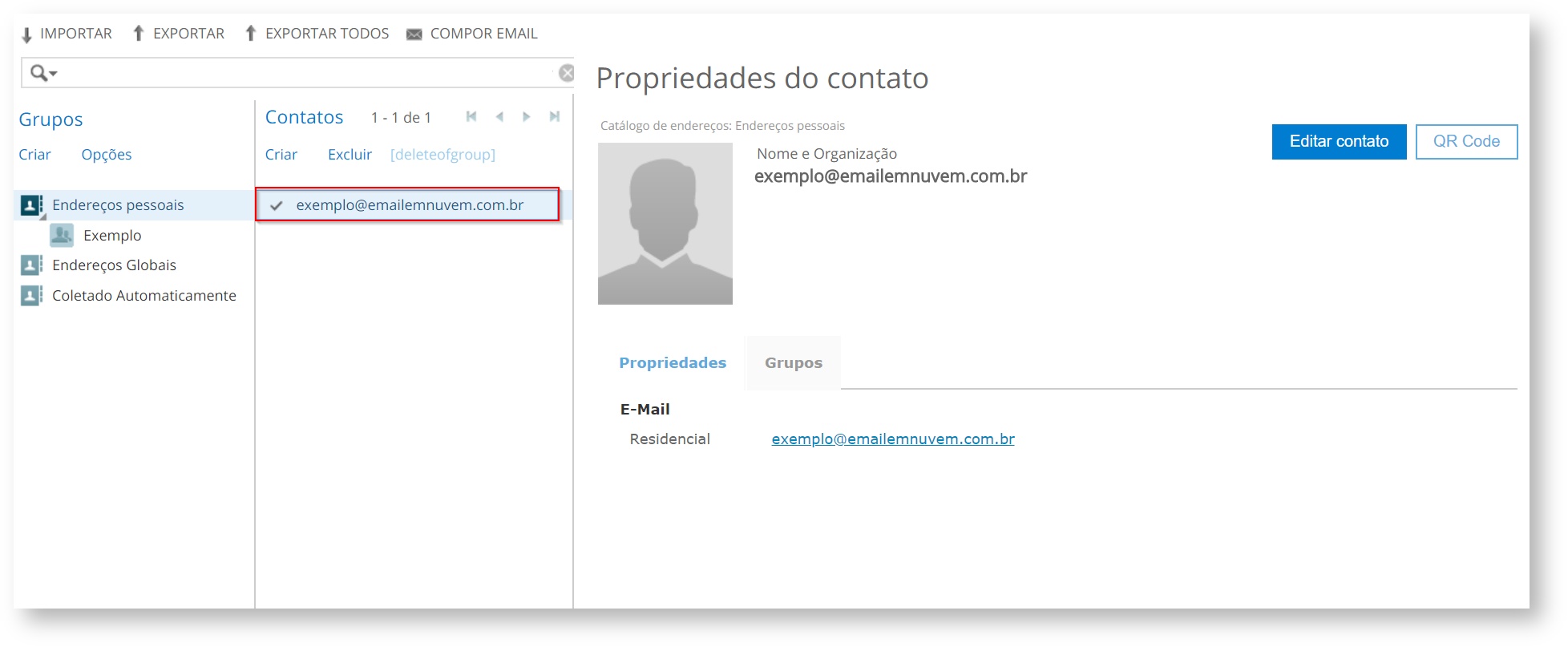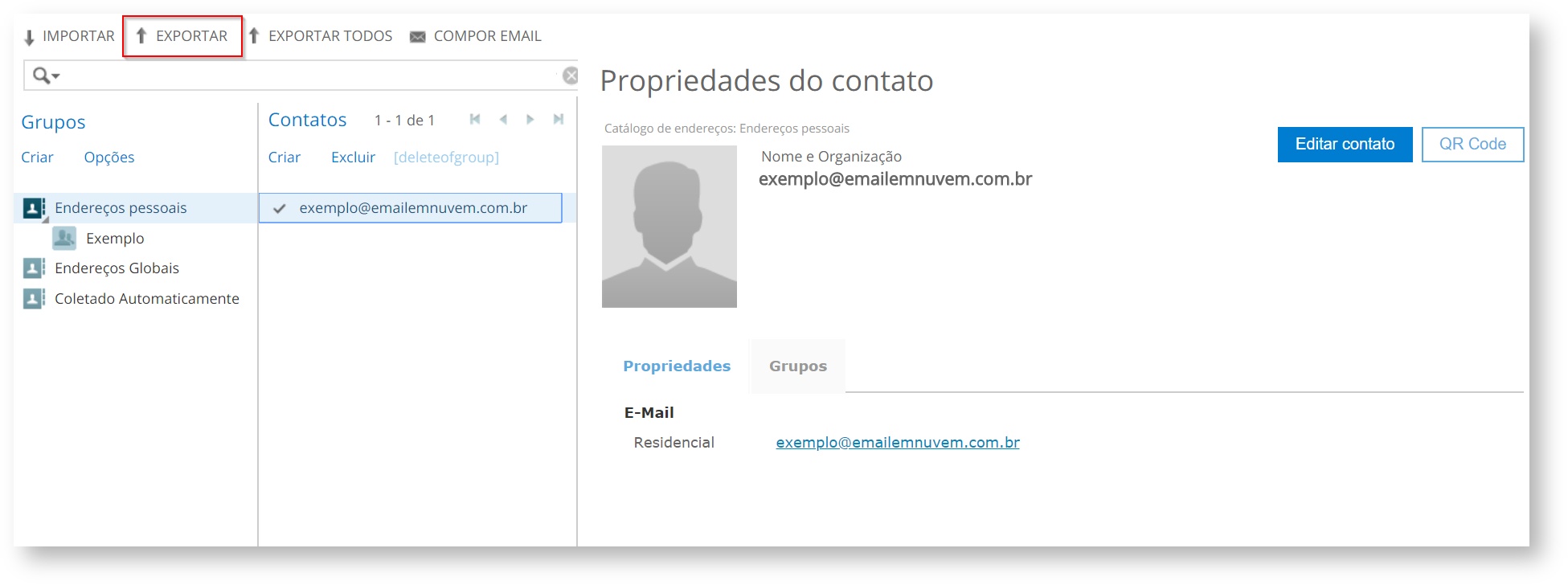 - Na aba “Contatos” do Webmail, clique no contato que deseja exportar: