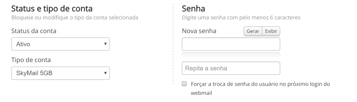 Forçar a troca de senha do usuário no próximo login do Webmail: se selecionada, o usuário terá que escolher a nova senha na próxima vez que for realizado o login;