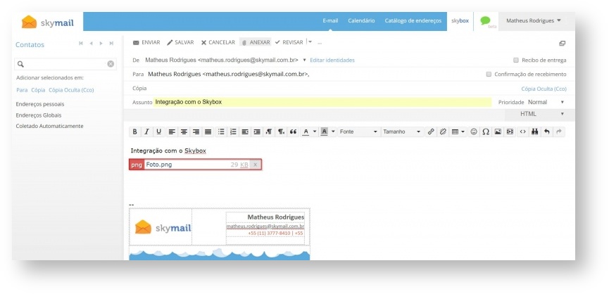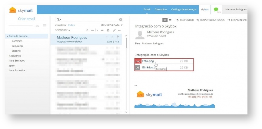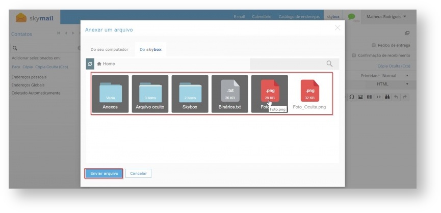 • Ao abrir a parte de anexar arquivos em um e-mail, uma janela é aberta, selecionando a aba “Do Skybox” é realizado o acesso a todos os arquivos e pastas disponíveis no Skybox possibilitando o anexo de um ou vários arquivos no e-mail: