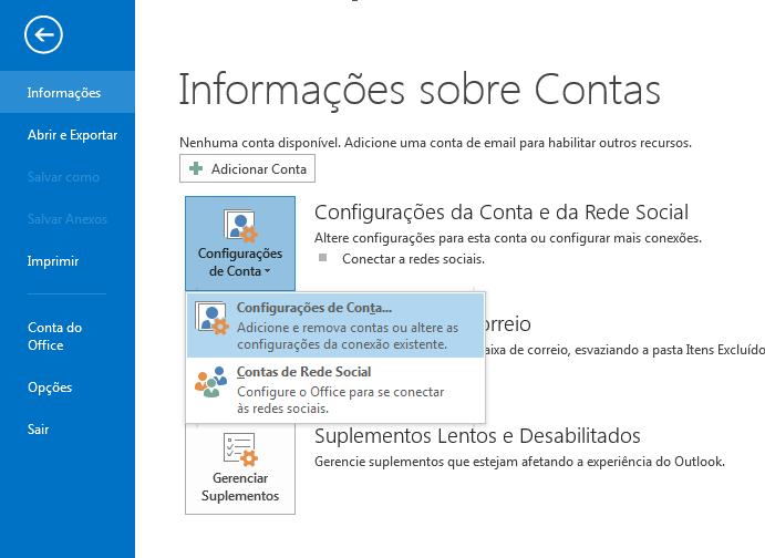 Na tela de Informações sobre Contas, clique na opção Configurações de Conta e em seguida clique em Configurações de Conta….