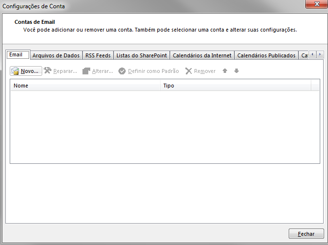 Na tela de Configurações de Conta, selecione a guia Email e clique em Novo.