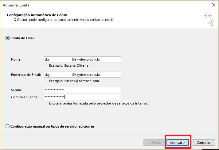 Selecione a opção Conta de Email, complete os campos Nome, Endereço de Email e os campos de senha em seguida clique em avançar.
