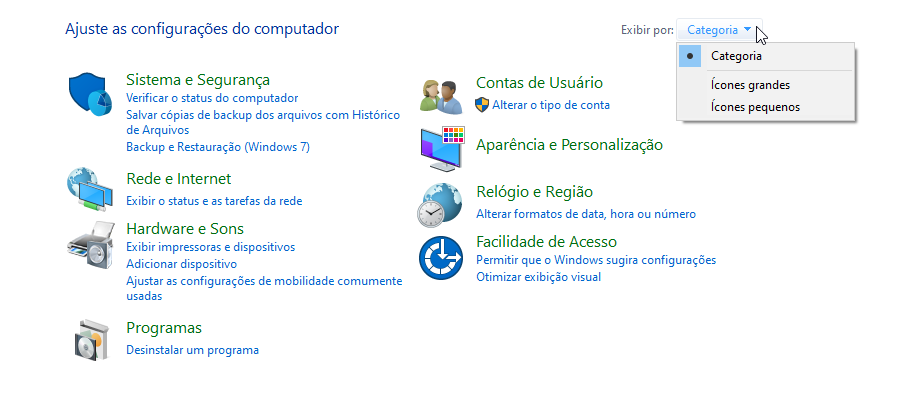 - No contato superior à direita, clique em Categoria e selecione “Ícone pequenos” ou “Ícones grandes”