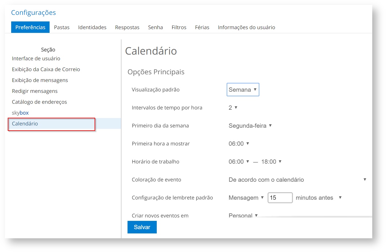 Visualização padrão: Nessa opção o usuário escolhe como será apresentado o calendário (por dia, semana, mês ou ano);
