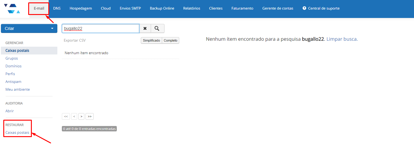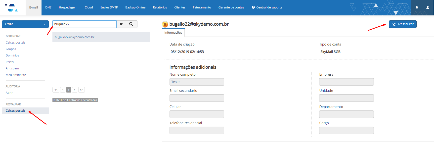 2) Pesquise a conta desejada e clique em Restaurar, no canto superior direito (botão azul), veja abaixo.