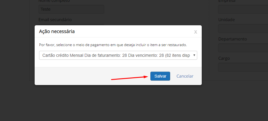 4) Após confirmar o restore, caso apareça uma tela igual abaixo, basta selecionar o ciclo de faturamento e salvar.